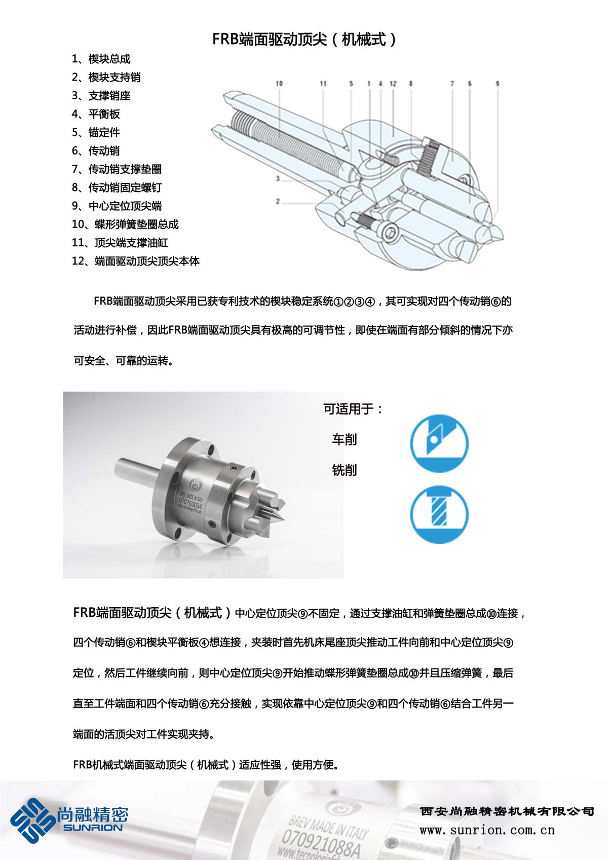 FRB公司(www.tecnologiefrb.com)位于意大利博洛尼亞市,自1960年起公司開始研發(fā)和生產(chǎn)活頂尖和端面驅(qū)動(dòng)產(chǎn)品,主要用于車削、磨削和齒輪加工。由于其FRB驅(qū)動(dòng)頂尖的技術(shù)創(chuàng)新,曾榮膺歐洲科技進(jìn)步獎(jiǎng)。