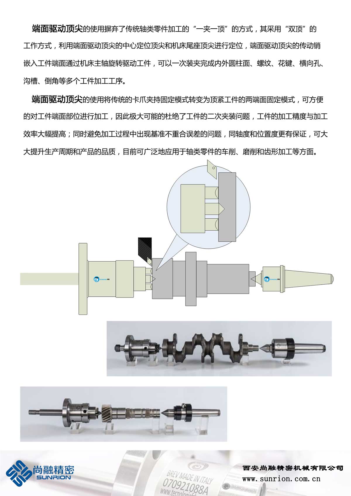 FRB端面驅動頂尖是一種新興的機床附件,依靠驅動卡爪嵌入工件端面使其隨機床主軸旋轉,從而完全替代了雞心夾頭和卡盤,一次裝夾即可完成各軸頸、端面、槽型和螺紋加工,在車銑中心上還可以一次完成鍵槽和油孔的加工,加工效率提高2倍以上,同軸度和位置度更有保證,因而越來越廣泛地應用于軸類零件的車削、磨削和齒形加工。