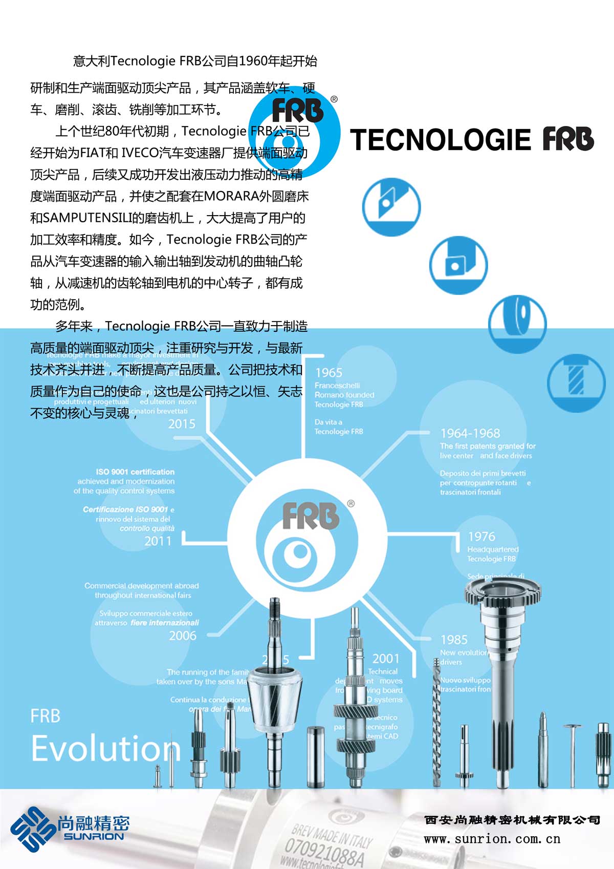 Tecnologie FRB公司位于意大利博洛尼亞市,自1960年起公司開始研發和生產活頂尖和端面驅動產品,主要用于車削、磨削和齒輪加工。由于其FRB驅動頂尖的技術創新,曾榮膺歐洲科技進步獎。